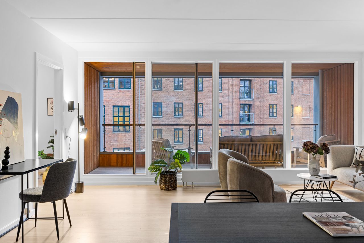 Allerede når man træder ind i lejligheden, mærker man det. Blikket trækkes automatisk mod lyset og videre ud. For her er det ikke stuen eller køkkenet, der først tager ordet, det er altanen/balkonen. Lejlighedens hjerte vender ud mod vest. En stor, indbydende altan/balkon, der fungerer som en naturlig forlængelse af boligen og binder inde og ude sammen på smukkeste vis. Inde i lejligheden samler det lyse køkken-alrum boligen, med udsigten som en konstant medspiller. Det er et rum, hvor hverdagen fungerer, og hvor man naturligt opholder sig, uanset om det er morgenkaffe, arbejde eller lange aftener med gæster. Lejligheden byder desuden på et indbydende badeværelse med vaskesøjle og god plads i hverdagen. De to regulære værelser er placeret i hver sin ende af boligen, hvilket giver en ideel opdeling. Planløsningen fungerer perfekt, hvad enten man er et par, har behov for hjemmearbejdsplads, eller ønsker en oplagt forældre- og børneafdeling, uden at gå på kompromis med sammenhængen i boligen. Amerika Plads er et levende og arkitektonisk smukt område med caféer, restauranter og byliv lige uden for døren. Samtidig er der kort afstand til både Nordhavns badezone og de grønne, rekreative omgivelser omkring Kastellet og Langelinie, oplagt til gåture, løb eller en rolig stund ved vandet. Hverdagen er nem med Østerport Station i nærheden, som giver hurtig adgang til både S-tog, regionaltog og metro, og på cykel når man Indre By på få minutter. En beliggenhed, hvor byens puls, vandet og de grønne åndehuller går op i en sjælden helhed. Der er naturligvis rigtig gode parkeringsmuligheder i den store parkeringskælder.