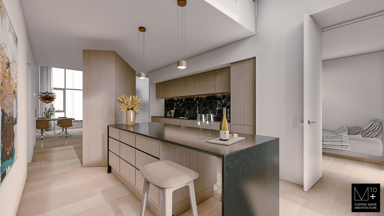 De 10 første fotos er hvordan det kan blive - Sælger er indstillet på dialog. Højt hævet over vandet og med et imponerende kig ned gennem havneløbet får du her en bolig på 169 m², hvor lys, luft og rene linjer spiller hovedrollen. Lejligheden ligger i en af Havneholmens mest markante ejendomme, og fra 5. sal får du et smukt udsyn, der giver rummene en næsten svævende oplevelse også fordi den eneste stue er opført som en indvendig balkon i boligen. Opholdsarealet er tænkt som hjemmets naturlige centrum, hvor både stue og køkken-alrum ligger i forlængelse af hinanden som et elegant, aflangt rum. De store vinduespartier understreger fornemmelsen af bredde og lys, og det er netop herfra – både fra stuen og fra køkken-alrummet – at du har udgang til lejlighedens to altaner. Det skaber en skøn fornemmelse af flow og giver gode muligheder for at trække ud i det fri, mens du stadig er tæt på hverdagens liv inde i lejligheden. Boligen rummer hele fem værelser, hvilket gør den oplagt til både børnefamilien, dem med behov for hjemmekontor, gæsteværelse eller blot mere fleksibilitet i hverdagen. Alle værelser præsenterer sig med et roligt udtryk og gode indretningsmuligheder, og planløsningen giver dig mulighed for at forme rummene præcis efter dit behov. De 2 badeværelserne er lækkert, moderne og praktisk indrettet med separat bruseniche og plads til vaskesøjle. Det er både funktionelt og flot udført, så det passer harmonisk ind i resten af boligens stilrene udtryk. Altanerne er oplagte steder at tage dagens rolige stunder, hvor udsigten til vandet giver en særlig ro. Fra 5. sal får du en flot dybde i kigget over havneløbet, og altanerne ligger, så du kan finde sol i løbet af dagen. Ejendommen tilbyder desuden en smuk, grøn gårdhave samt eftertragtede fælles faciliteter som fitnessrum og kajakopbevaring. Mulighed for tilkøb af parkeringsplads er tilgængelig. Havneholmen er et område i rivende udvikling – et bymiljø hvor livet omkring vandet fylder. Her bor du få skridt fra havnebadet, indkøb, caféer og Fisketorvets mange tilbud. Offentlig transport når du til fods, hvad enten du skal med metro, bus eller S-tog, og både Vesterbro, Islands Brygge og Indre By er inden for nem rækkevidde.