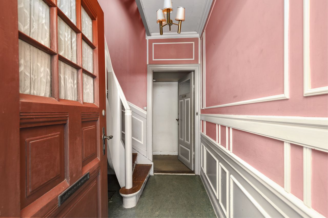 indeholder entre med toilet, flot trappeløb til 1.salen samt nedgang til underetagen. Fra entreen kommer