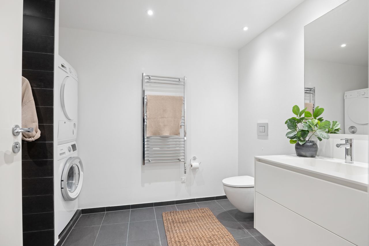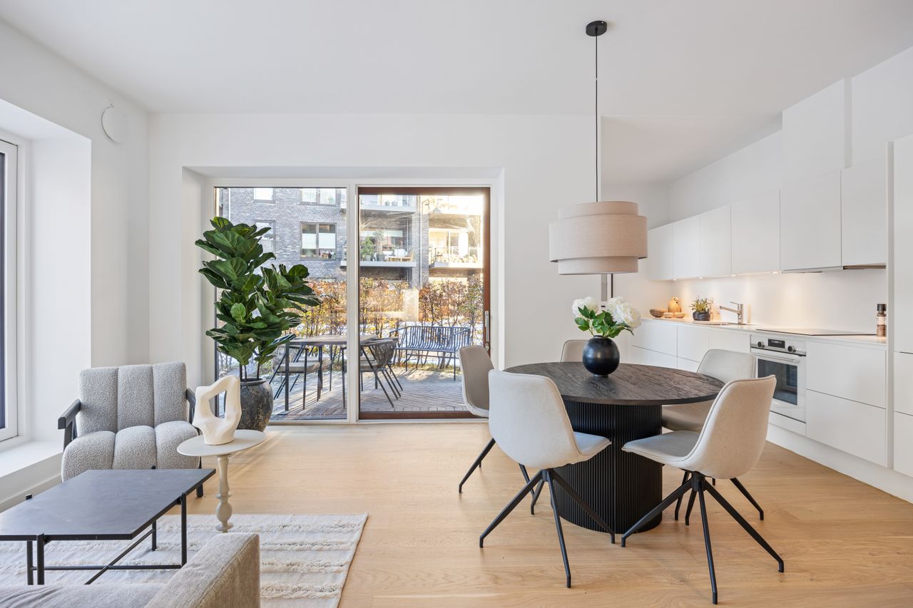 Lejligheden er 78 m², den føles større, fordi de store vinduespartier lukker masser af lys ind og giver rar atmosfære. Det er en af de boliger, hvor man straks mærker hyggen og roen, når man træder ind – lyset, planløsningen og stemningen arbejder virkelig godt sammen her. Lækkeret badeværelse naturligvis med stor bruseniche, vaskesøjle samt gulvvarme, ligesom i resten af boligen. Her er absolut ingen spildplads i lejligheden, det skønne køkken-/alrum-/stue er med god plads til både spiseafdeling og den behagelig store sofa. Rummet har hele 2 udgang til den solrige og private terrasse og her er både inde som ude et flot kig henover ejendommen grønne fællesareal.